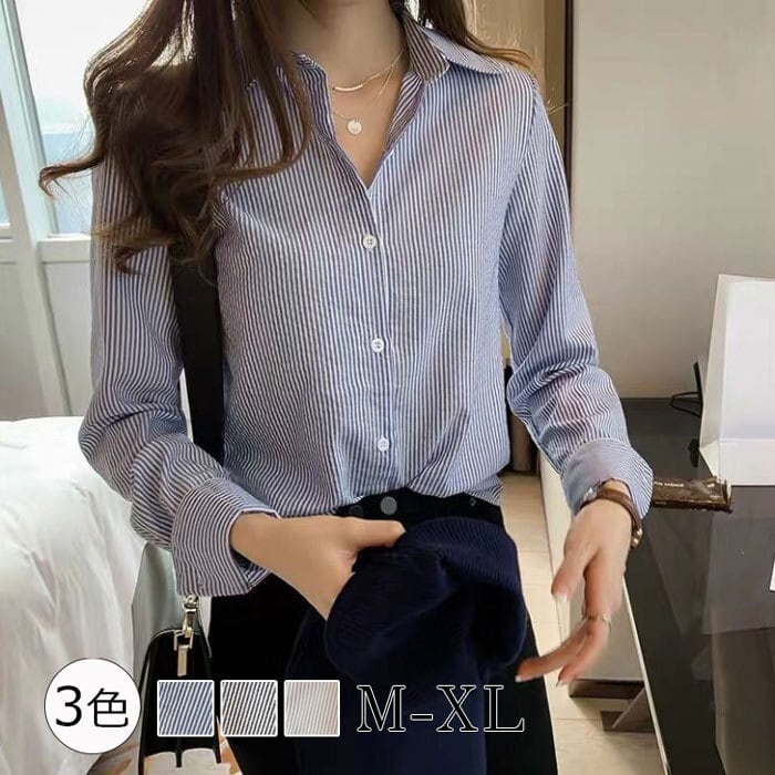 ストライプシャツ レディース 長袖 3色 M L XL ブラック ブルー ベージュ きれいめ シンプル カジュアル ストライプ シャツ トップス ストライプ柄 トップス ブラウスシャツ チュニック オフィス 通勤 大人 20代 30代 40代 秋物 春物 ブラウス OL | THE TNK-SHOP