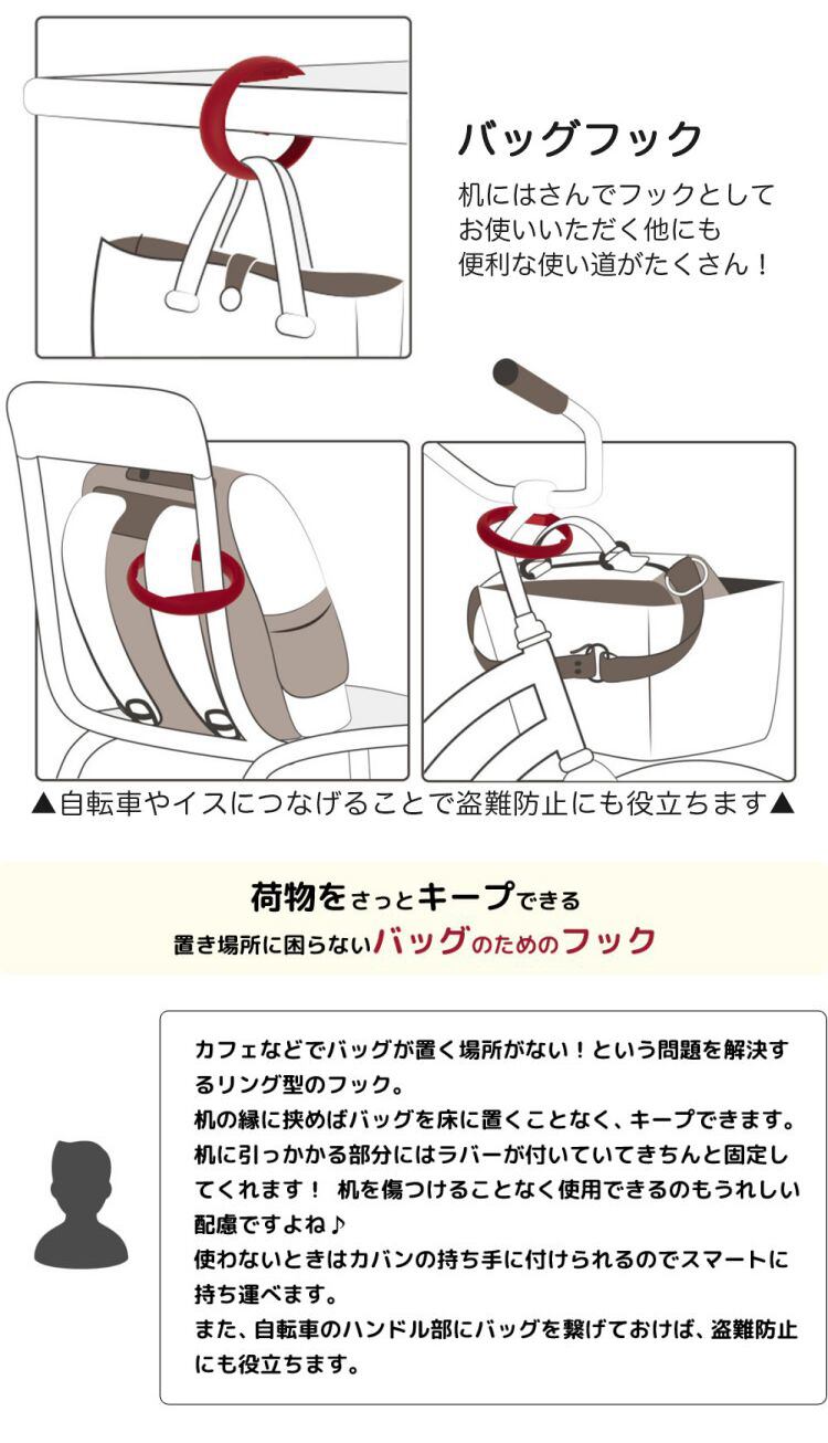 こちらのバッグハンガーはリングタイプですので、ラックやポール等にバッグを吊るすことも可能です。 また椅子の足などに固定することで、カバン掛け以外に簡易防犯対策としても使えます。