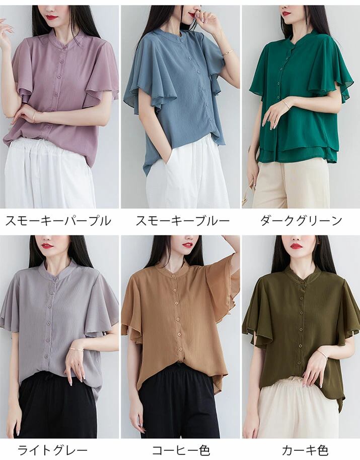 シフォンブラウス 半袖 レディース フリル袖 半袖 シフォン ブラウス バンドカラー シャツ シフォン バンドカラーブラウス ふんわり袖 母の日 ギフト プレゼント 大人 ファッション 春 トップス 大きいサイズ 涼やか シフォン 20代 30代 40代 | THE TNK-SHOP
