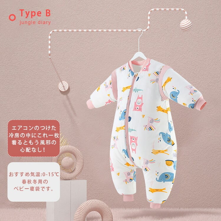 袖が取り外し可能で、気温や使い場合によって、お子様の体調に合わて着るタイプを選択できる多機能ベビー用着る布団です。スリーパーとしてはもちろん、ベビーが大きくなったら外出の服?としても重宝できます。エアコンのつけた冷房の中にこれ一枚着るともう風邪の心配なし!