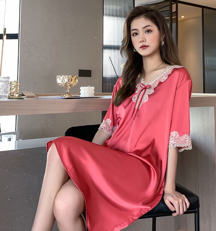 ネグリジェ パジャマ セクシー ランジェリー サテン セクシー ナイトドレス ルームウェア レディース 半袖 透けない 花柄 レース リボン シンプル 膝丈 Vネック ガウン ワンピース 下着 レディース ナイトウェア 母の日 プレゼント | THE TNK-SHOP