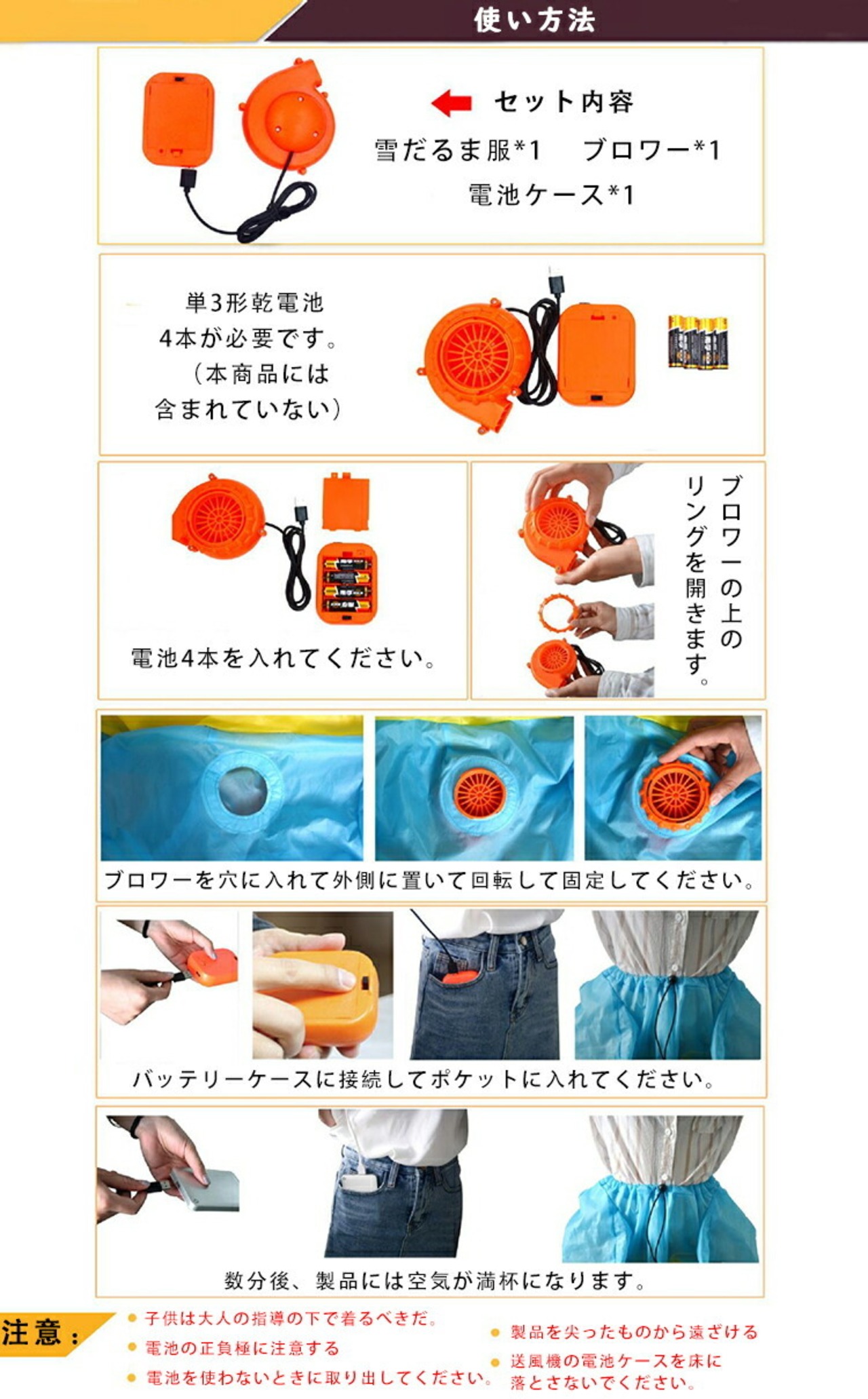 商品内容 雪だるま服*1 ブロワー*1 電池ケース*1