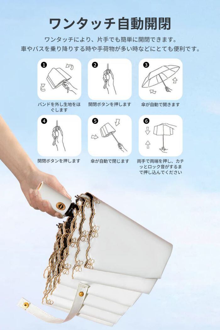 【自動開閉おりたたみ傘】ワンタッチで開閉できる、3段折りたたみ日傘。ハンドル部についているボタンを押すと自動で開き、再度ボタンを押すと閉じることができます。車 やバスを乗り降りする時や手荷物が多い時などにとても便利です。普通な通勤用カバンや車に常備しておけば、緊急天候にも対応できます。