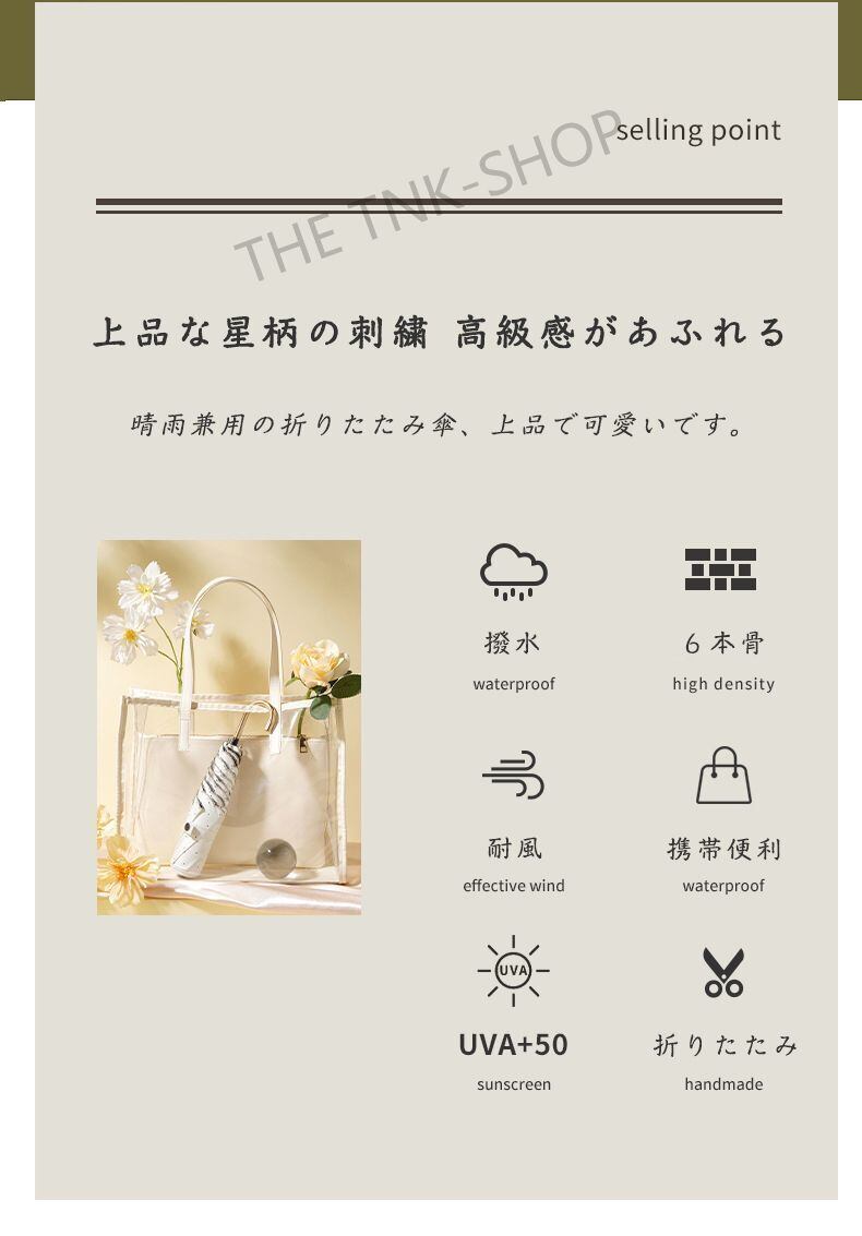 ゴールド糸を使用したの刺繍が魅力です。スタイリッシュな外観の傘は、家族、友人、同僚へのプレゼントとしてもおすすめです。光沢のあるゴールドのハンドルが高級感を演出します。通勤、通学、スポーツ観戦、夏フェス、イベント、キャンプ、遠足、アウトドア、旅行など用の折りたたみ日傘は、便利な持ち運びに便利なアイテムです。