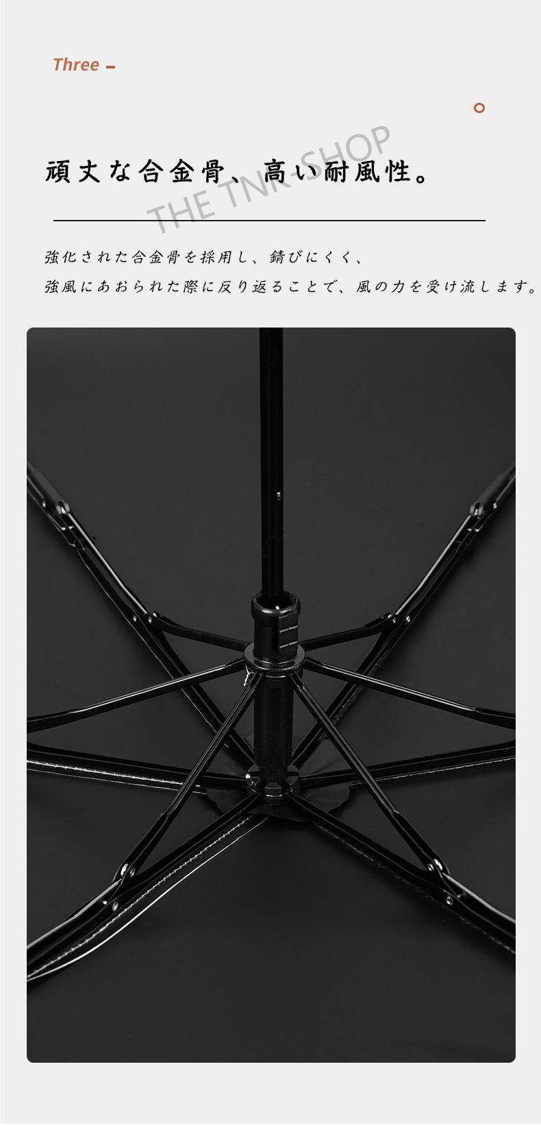 頑丈で耐久性のあるグラスファイバー製傘骨を6本使用しており、強風を受け渡し、親骨の柔軟性と耐久力を向上しました。アルミスチール製の骨組みで、頑丈で錆びにくいです。もし強風で折りたたみ傘が反り返ってしまっても開閉ボタンをプッシュすれば元通り!強風に煽られても安心です。