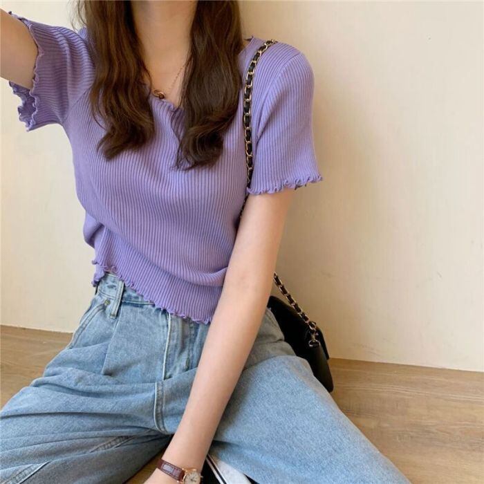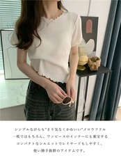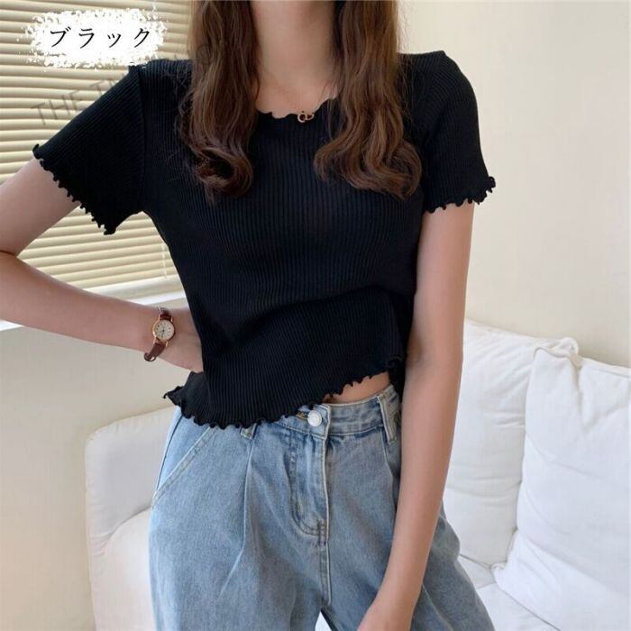 トップス Tシャツ レディース 半袖 メロウフリル トップス リブ おしゃれ かわいい フレンチスリーブ 夏 白 黒 きれいめ 無地 ミディ丈 クルーネック シャツスリーブ 薄手 伸縮性 ぴったり フィット 可愛い きれいめ シンプル 着痩せ 通勤 通学 | THE TNK-SHOP