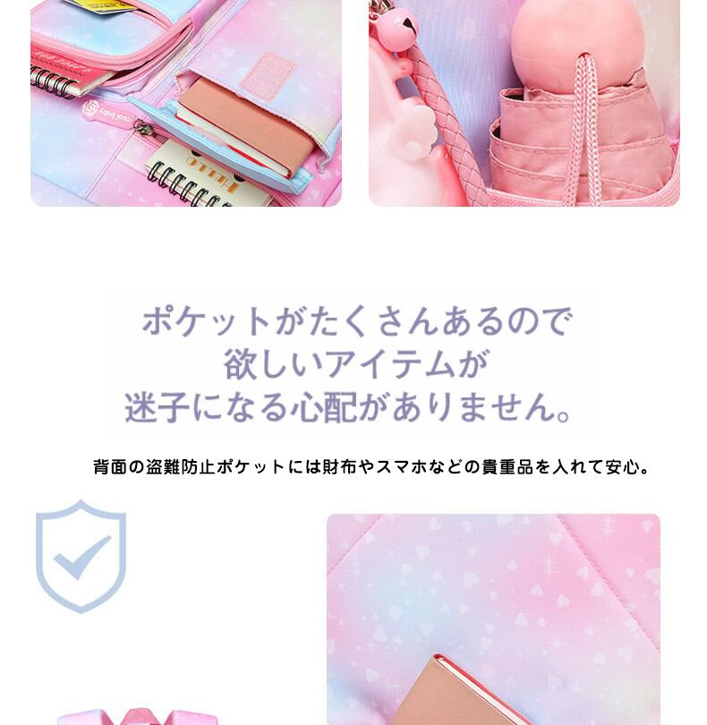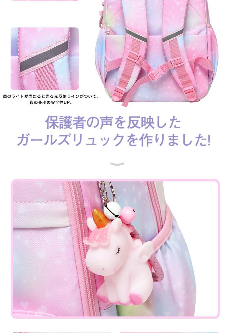 商品紹介 可愛いデザインとパステルカラーが大好きな、お子様におすすめのガールズリュックです。鈴のついたユニコーンチャーム付きでお出かけが楽しくなります。ショルダーずり落ち防止のチェストストラップを付ければさらに快適。通学、通塾、習い事、遠足、ハイキング、修学旅行など幅広くご利用いただけます。プレゼントにも最適。