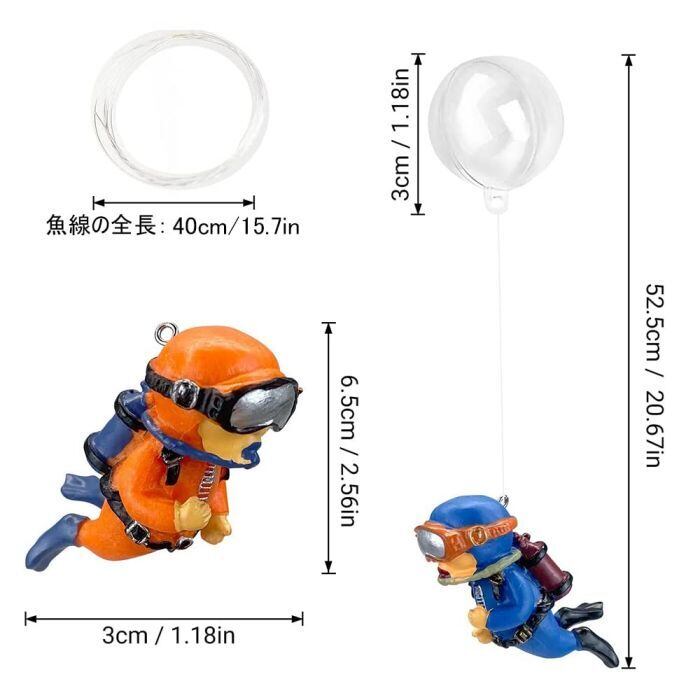 【パッケージ内容】ダイバー×4、透明浮遊球×4、線×4。サイズ:幅6cm、高さ3.5cm;カメラを持って写真を撮る潜水士と酸素マスクをつけた潜水士です。