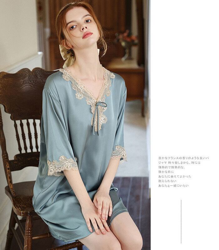 ネグリジェ パジャマ セクシー ランジェリー サテン セクシー ナイトドレス ルームウェア レディース 半袖 透けない 花柄 レース リボン シンプル 膝丈 Vネック ガウン ワンピース 下着 レディース ナイトウェア 母の日 プレゼント | THE TNK-SHOP
