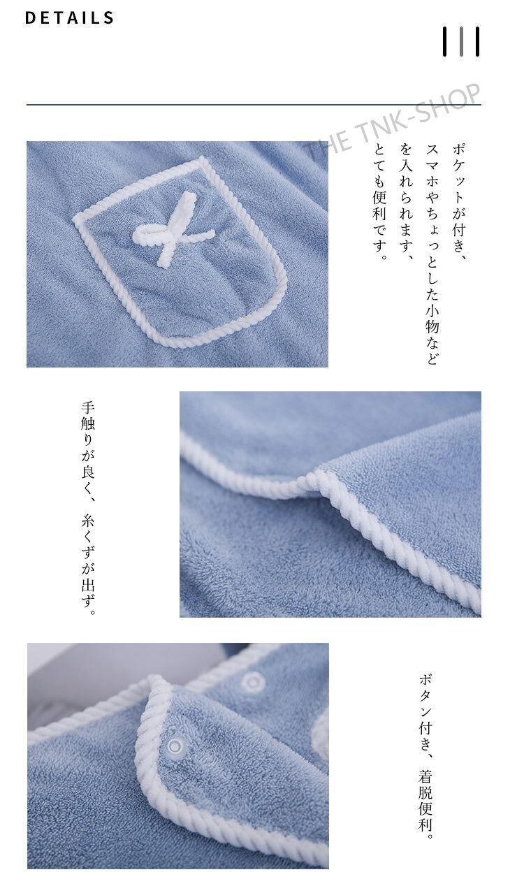 商品紹介 ※肩がけボタンでサッと着て、ズレ落ちません。 マイクロファイバー素材だから、肌触りが柔らかくふわっふわっモコモコで吸収性抜群! あなたを優しく包み込みます♪ 胸元リボンで可愛らしさUP。