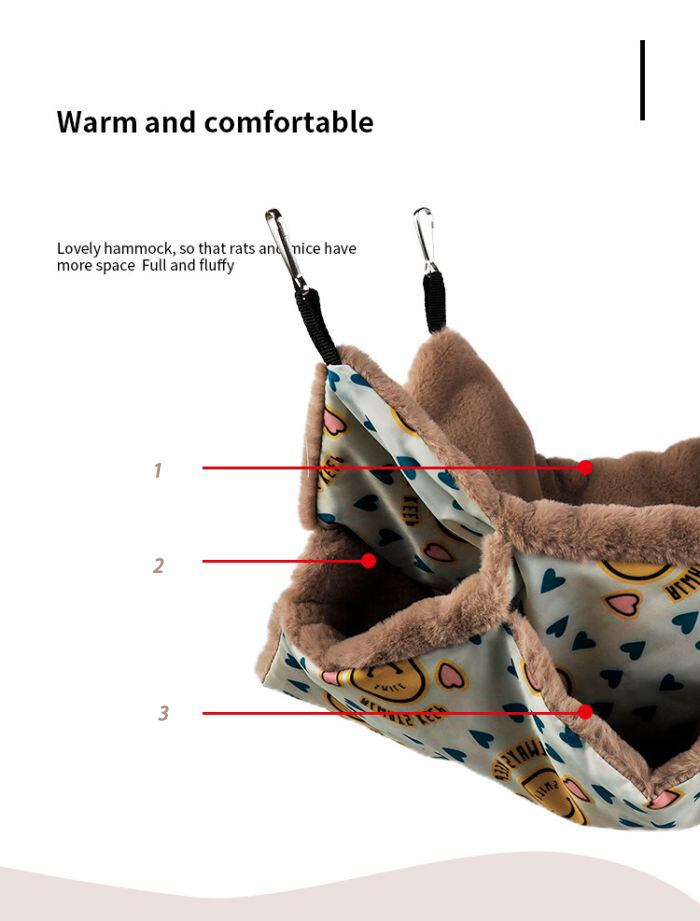 ・小動物用ハウスとして、フェレットやモルモット、チンチラなどの冬用保温や寒さ対策に最適です。 ・三層構造のハンモックは、小動物たちの睡眠や体の回復を行うため、またや遊び場として安全で温かい場所を提供することを目的としています。