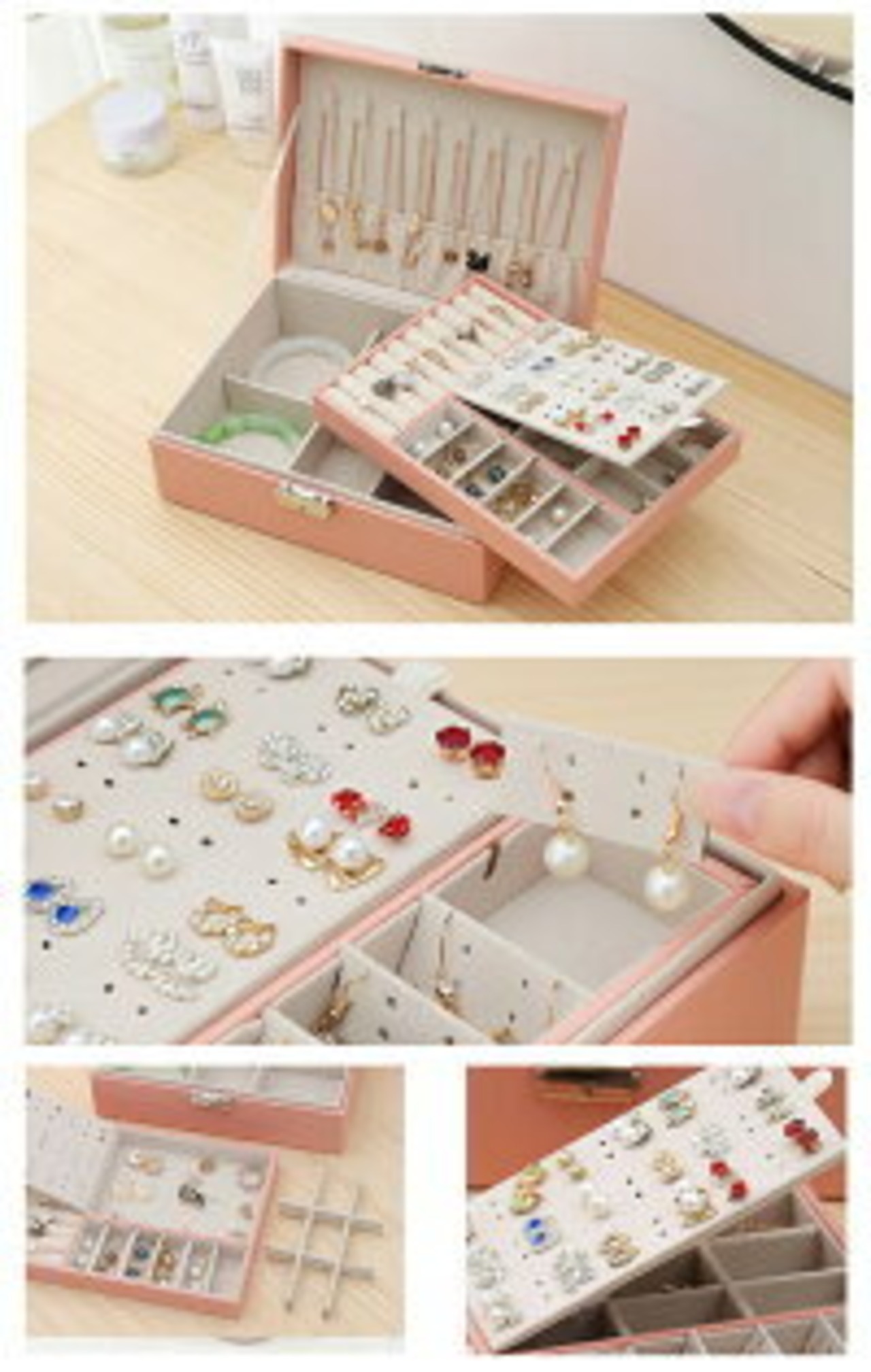 2段式なのでたくさん入ります。絡まないネックレス収納 8ヶ所、ピアスボード 74枚所、ピアスボード下 9ヶ所、指輪・イヤリング15ヶ所、2段式の下スペース 6ヶ所収納できる大容量タイプです。チョーカー、アンクレット、ブレスレット、バングル、リストバンド、ブローチ、コサージュ、チャーム、ヘアアクセサリーなども保管に。アクセサリーを100個以上収納できるジュエリーボックスです。